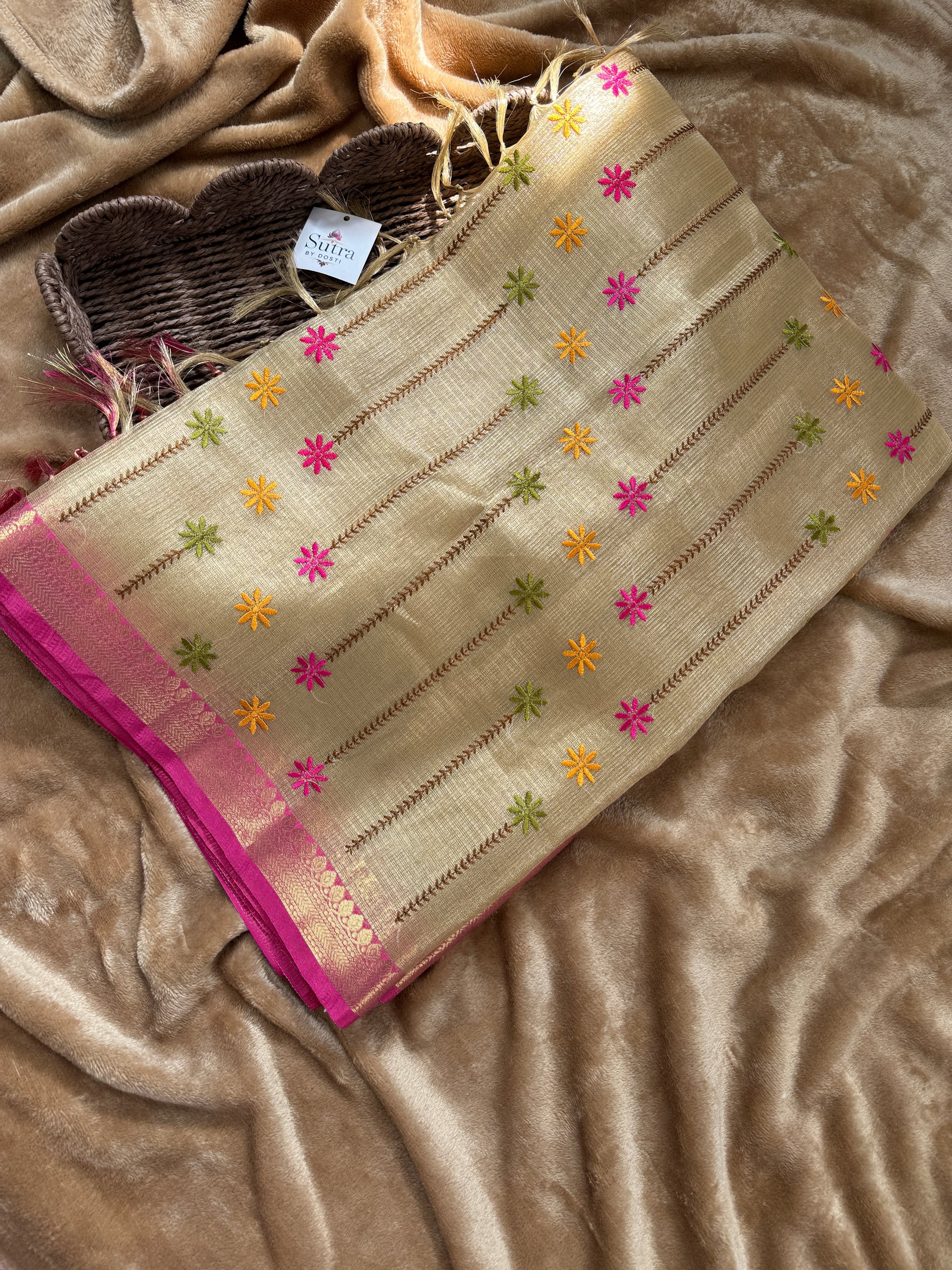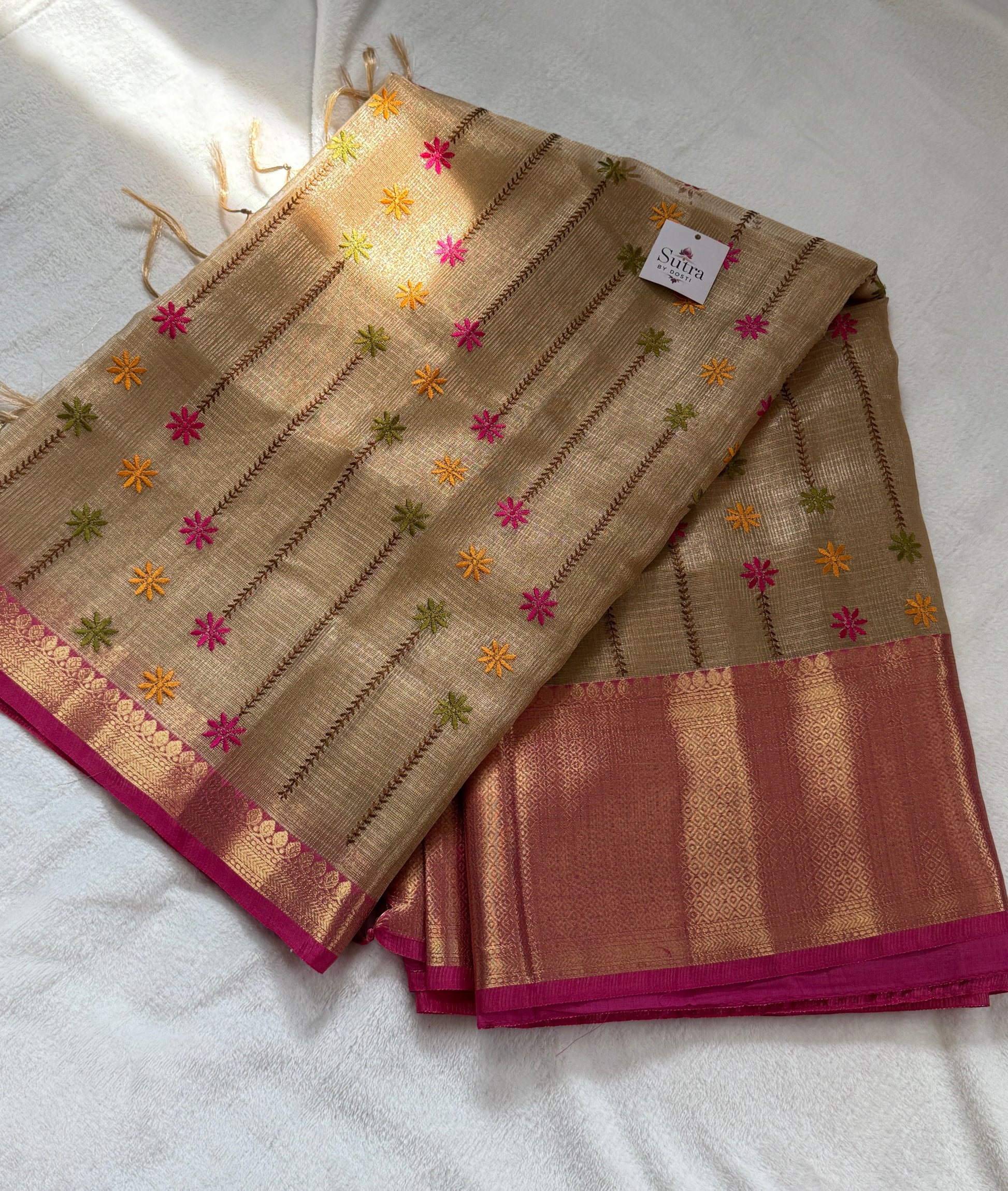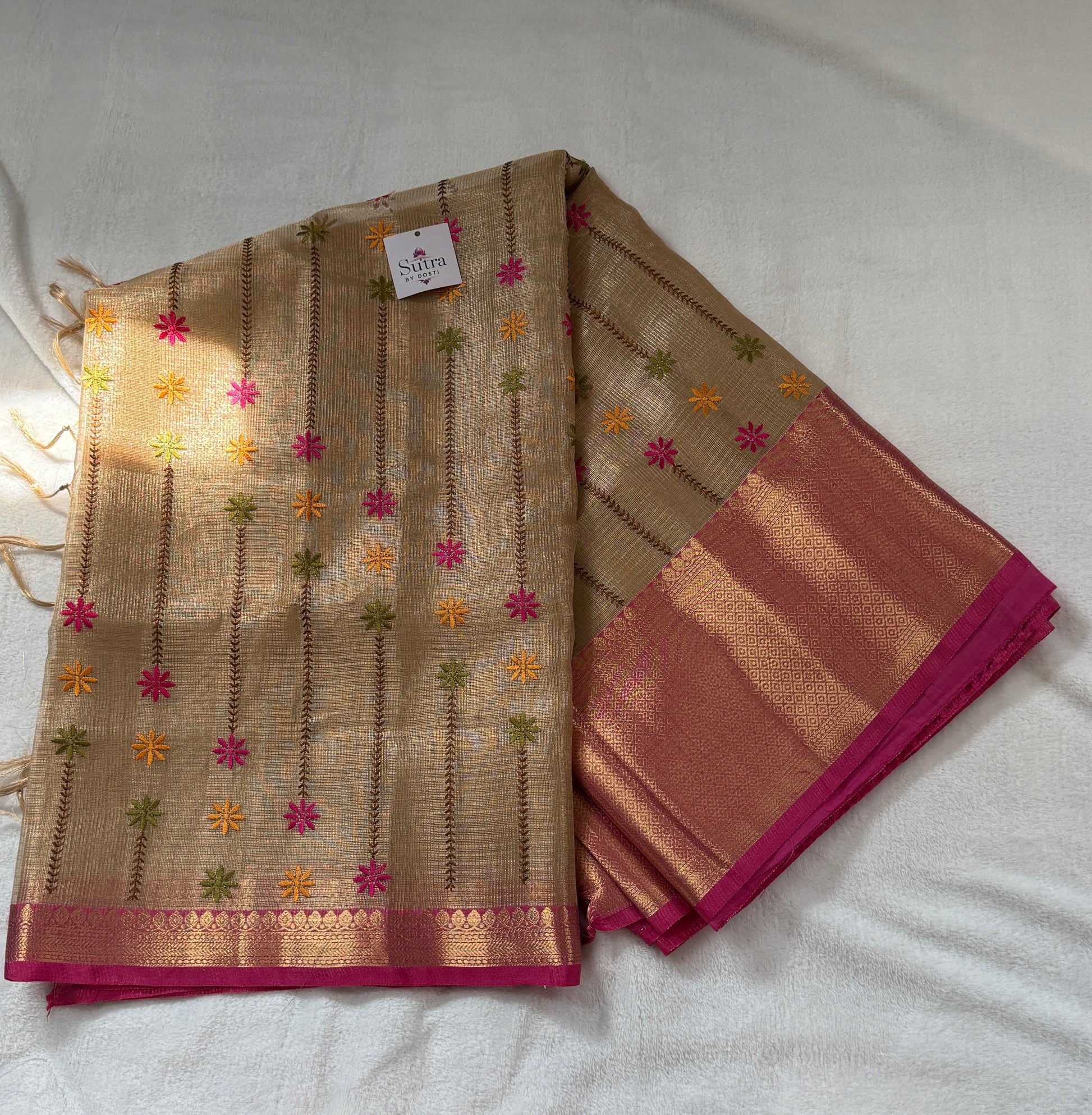 Fabric: Tissue silk Blouse: Tissue silk Saree Length: 5.5 Mtr. Blouse Length: 0.8 Mtr. Work: Zari weaving work Care: Dry clean only |