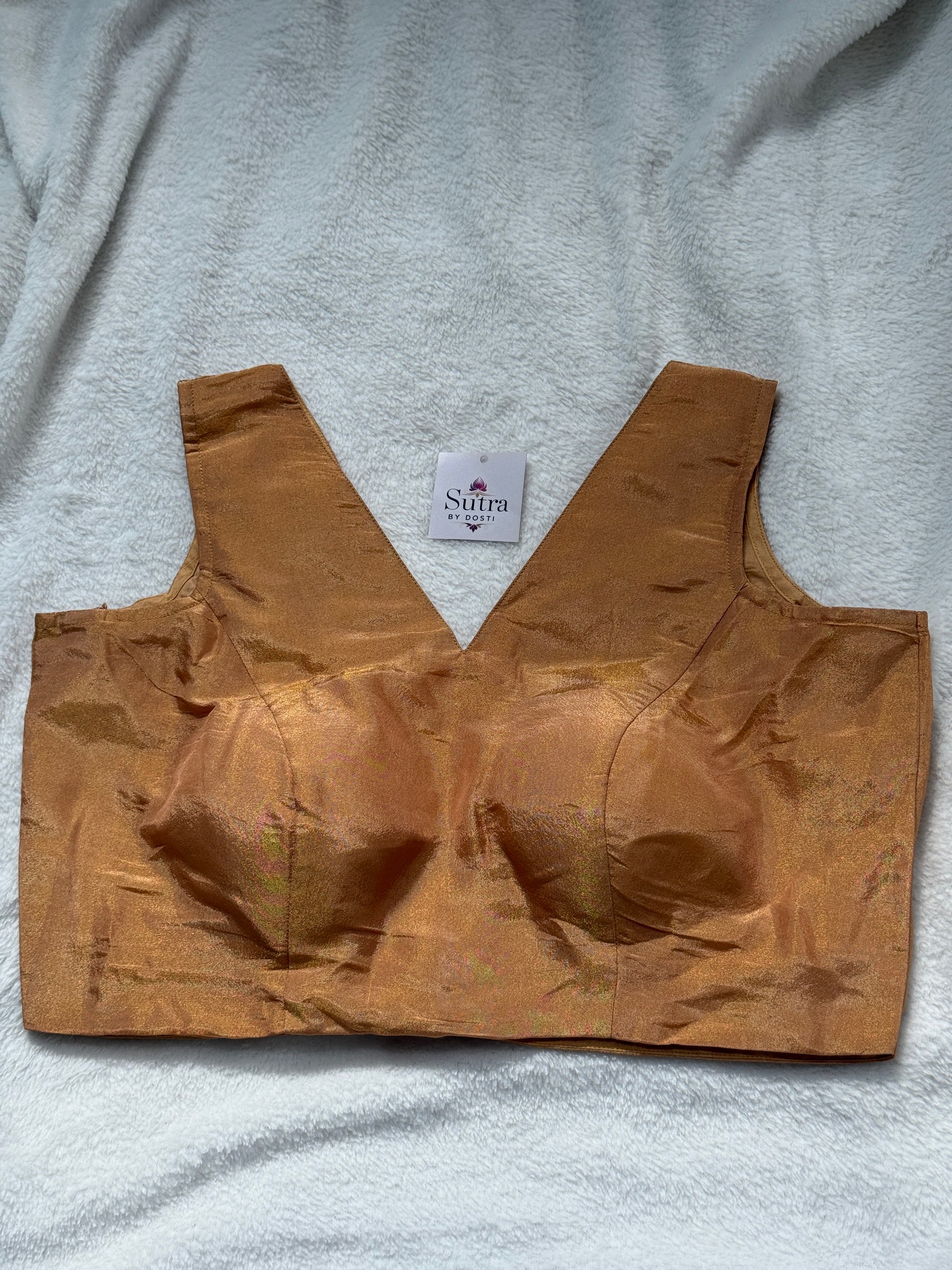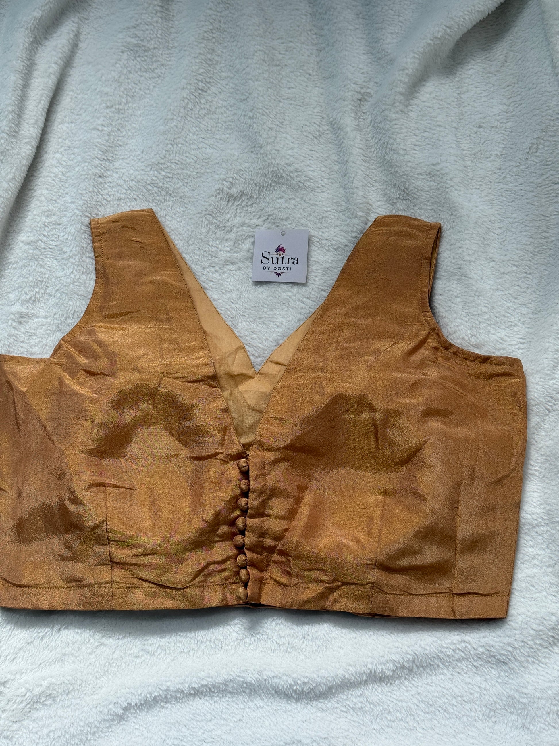 A stunning sleeveless blouse crafted from luxurious artificial silk, designed for elegance and comfort. The wide V-neckline enhances your silhouette, while the padded design ensures a perfect fit. Lined with soft cotton for added comfort, this blouse is perfect for pairing with festive sarees and lehengas.