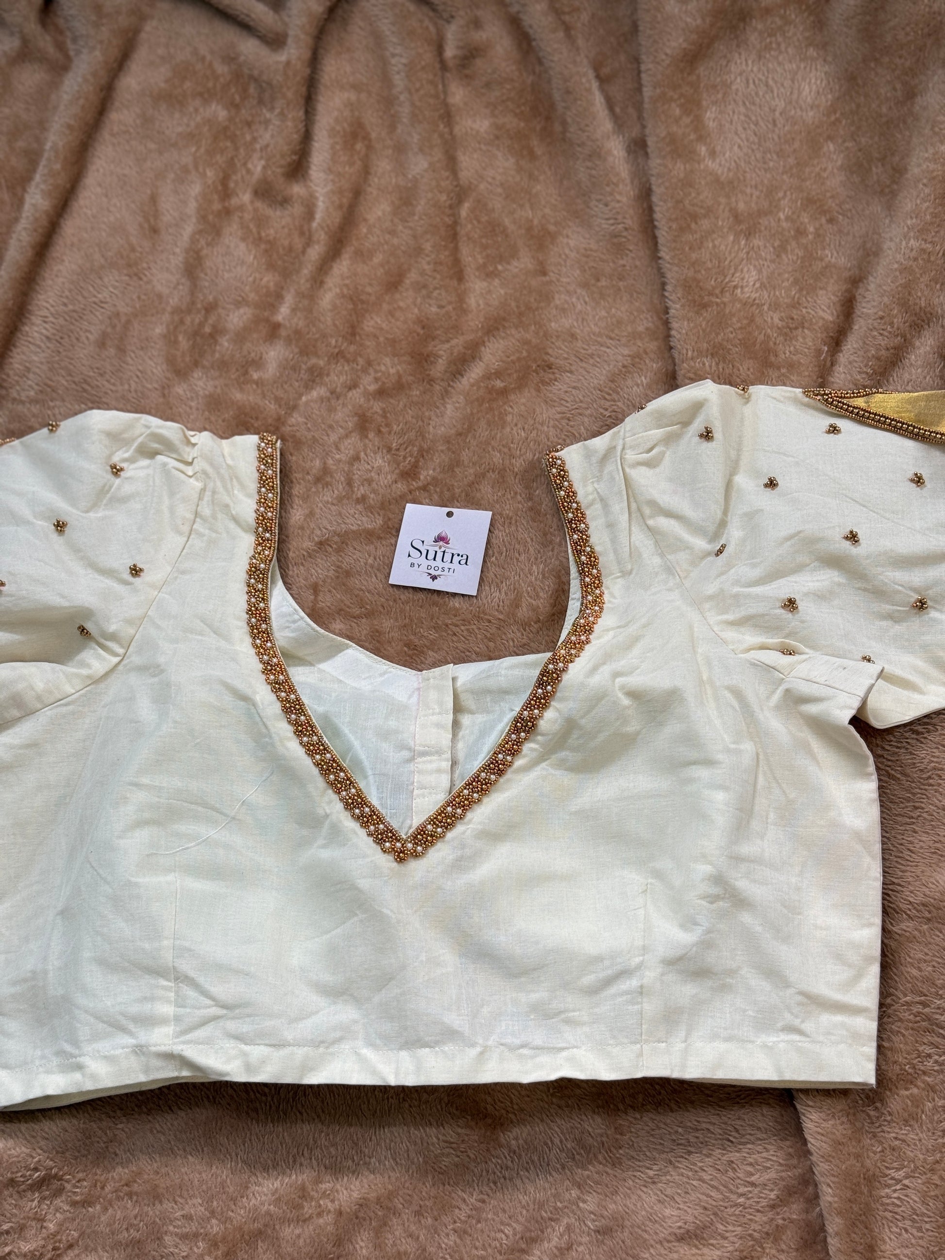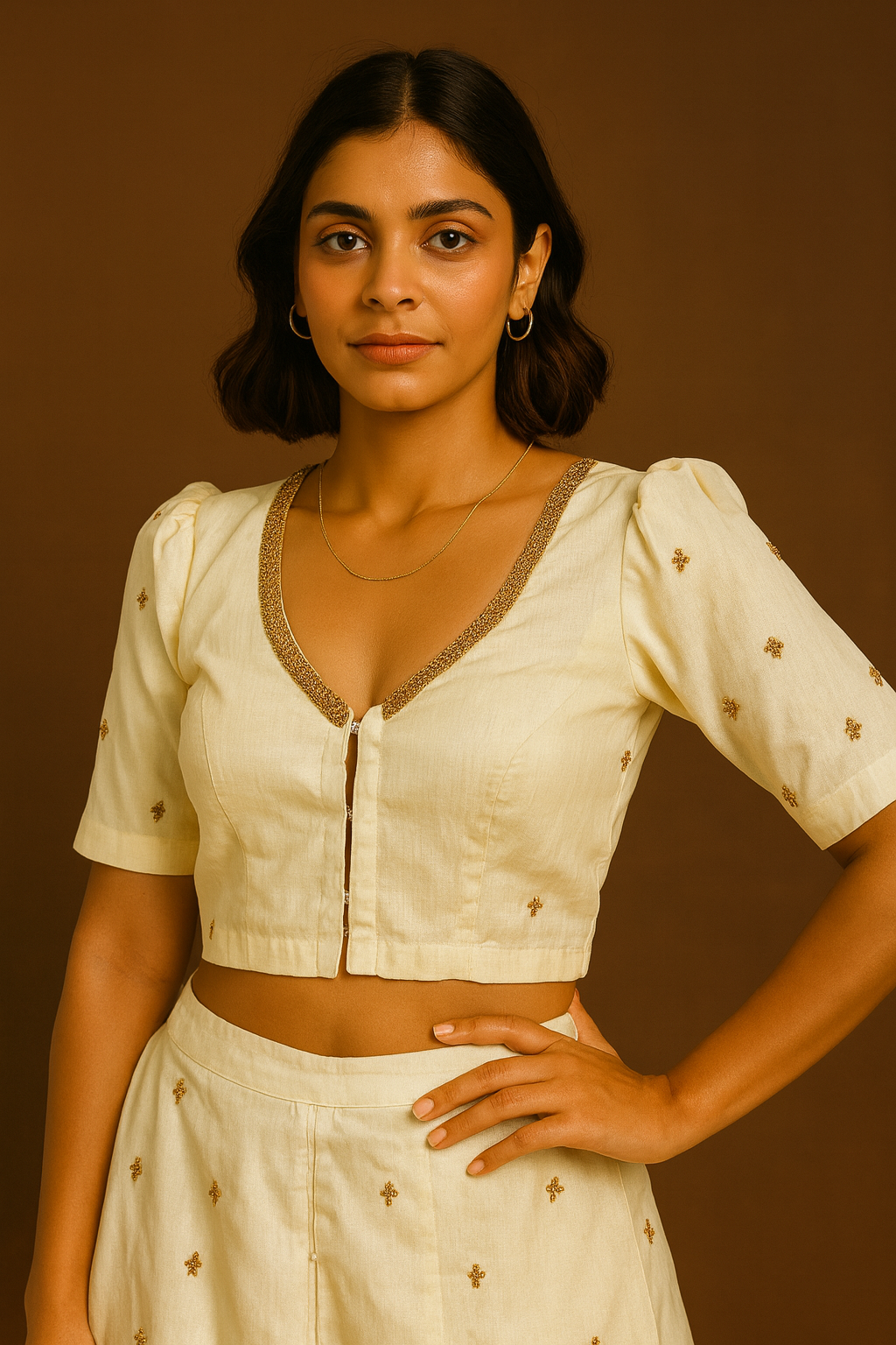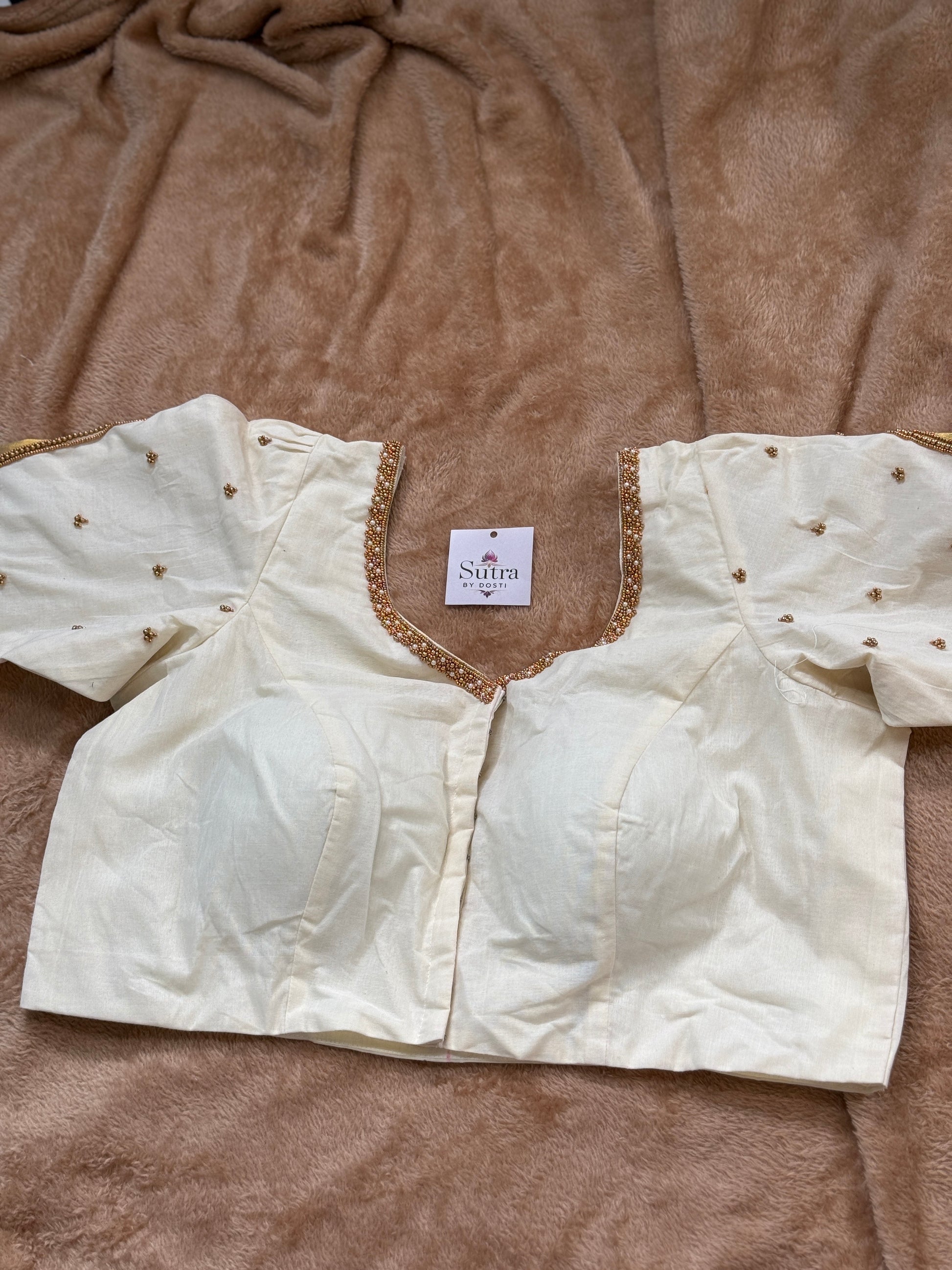 Understated elegance meets comfort in our Ivory Royale Blouse. Crafted from premium cotton, this padded blouse features elbow sleeves, delicate embellishments, and a graceful small U neckline with front hook closure. Perfect for pairing with sarees or skirts for festive and contemporary looks.