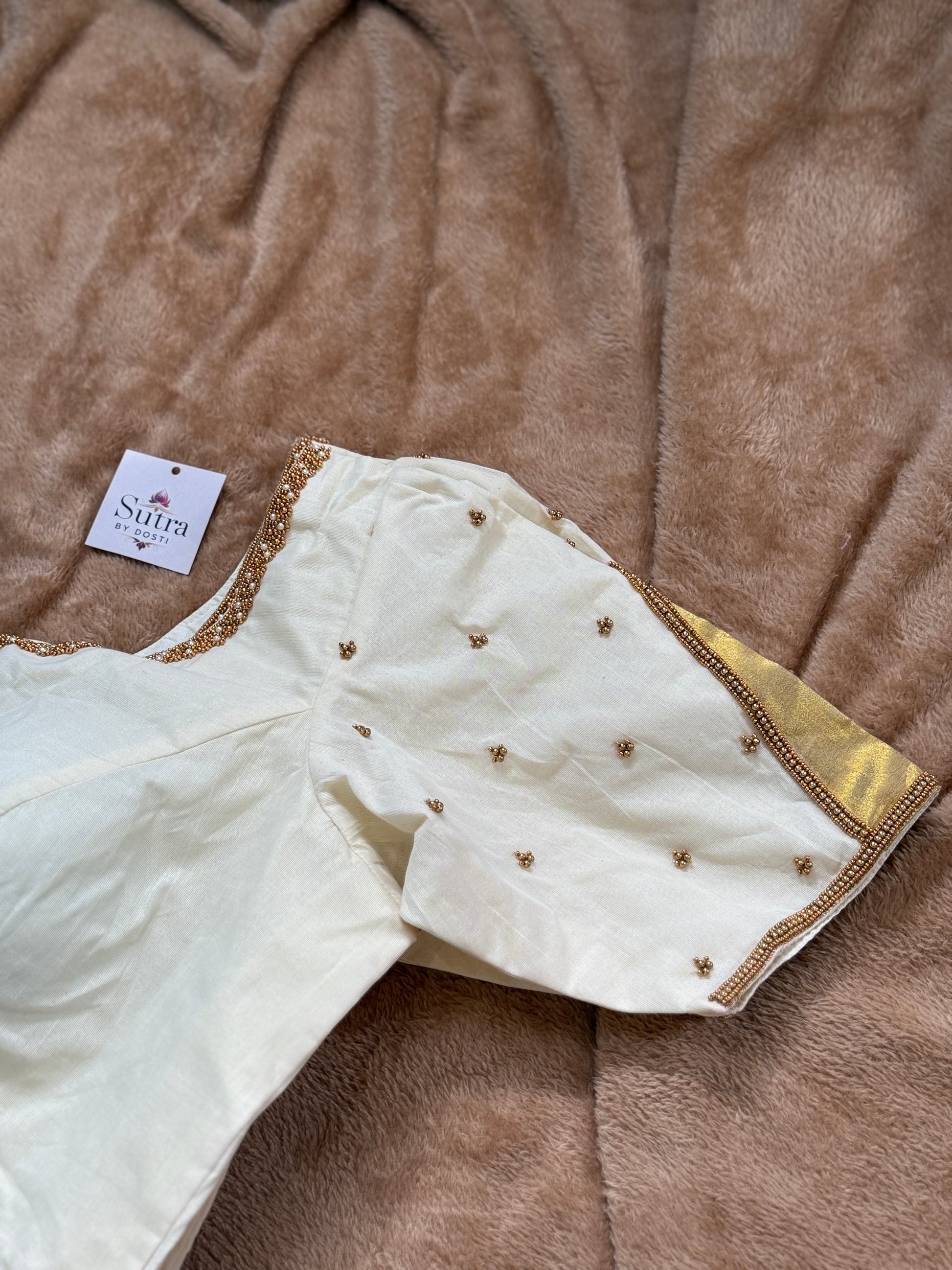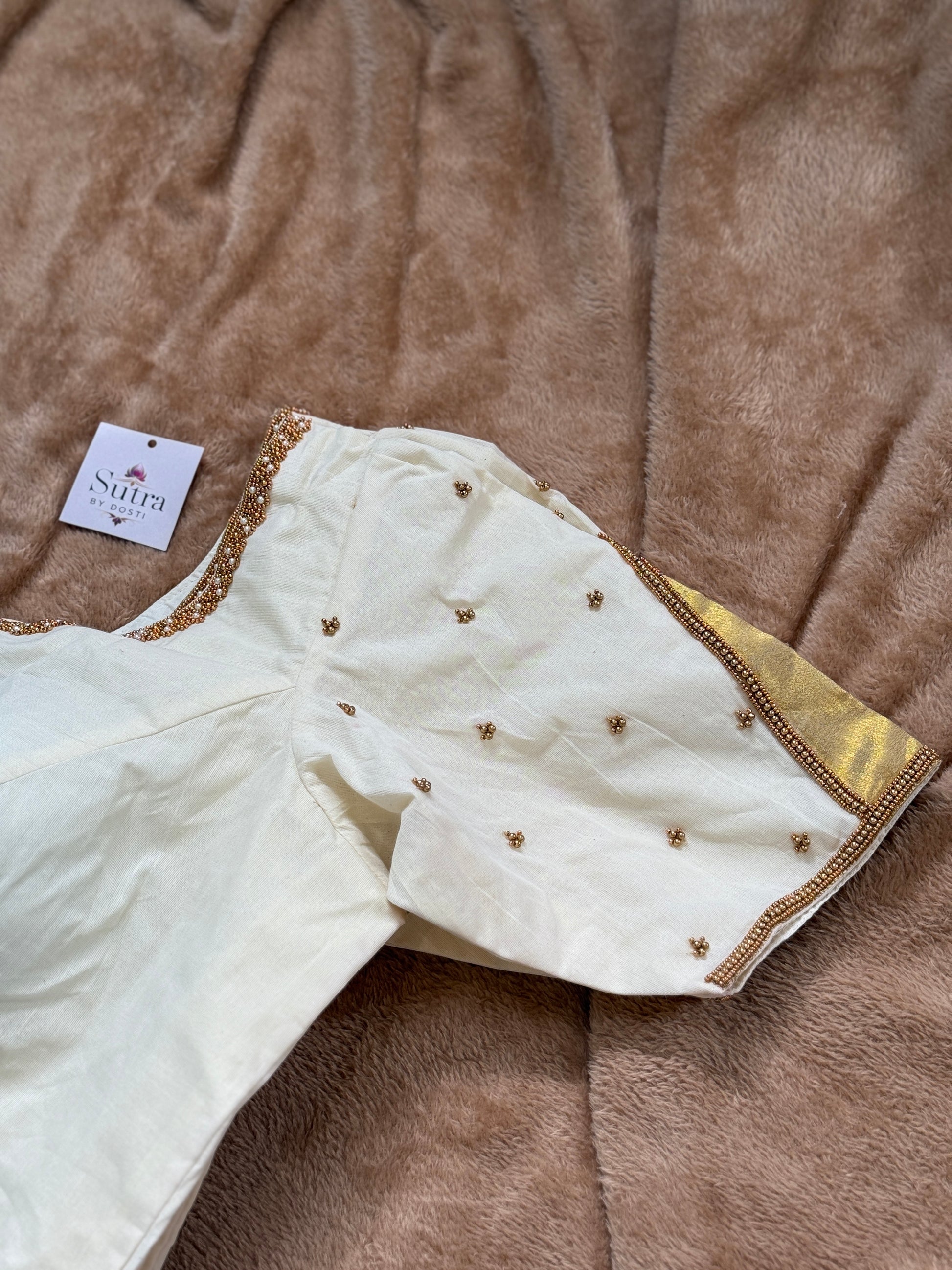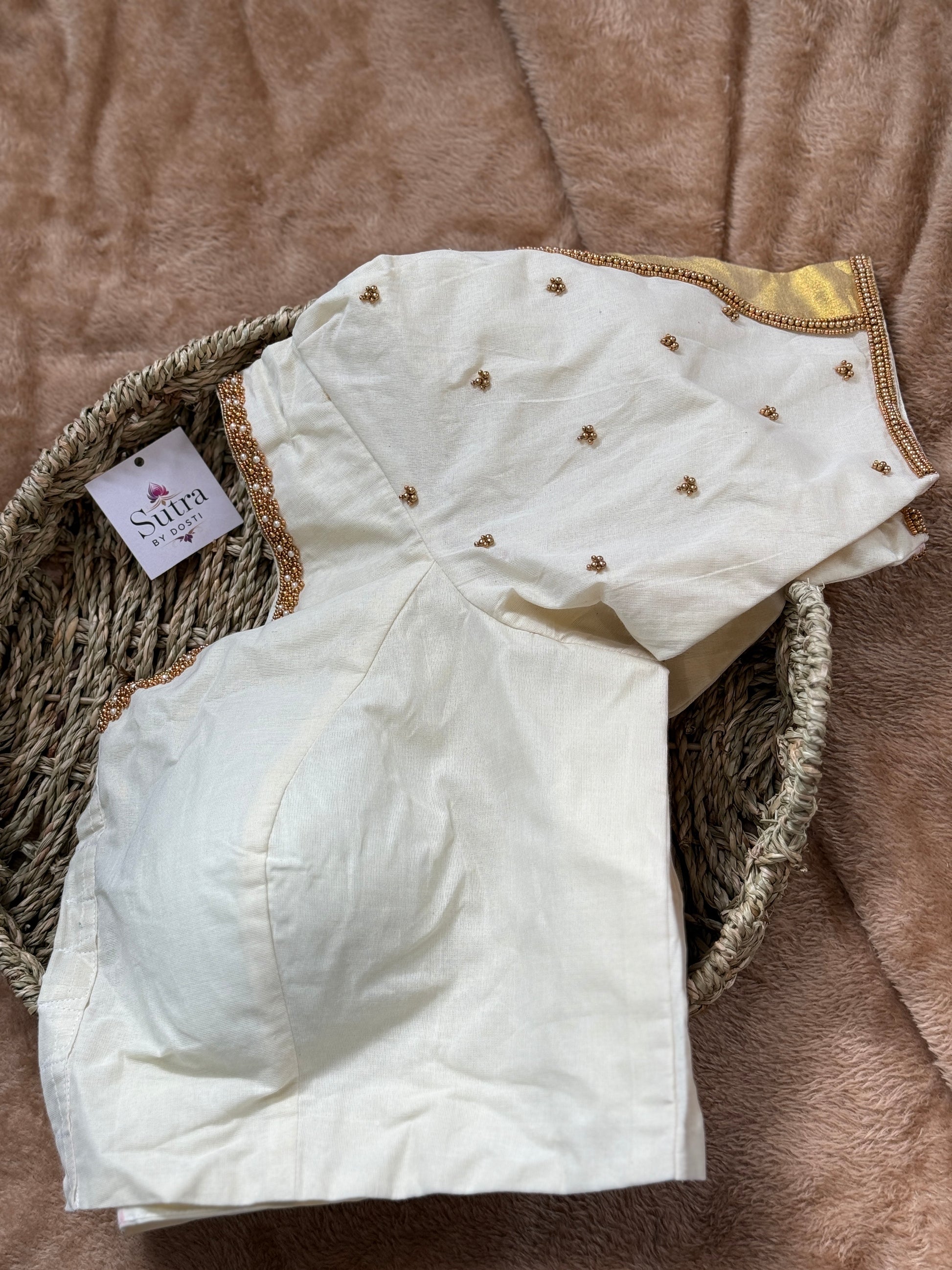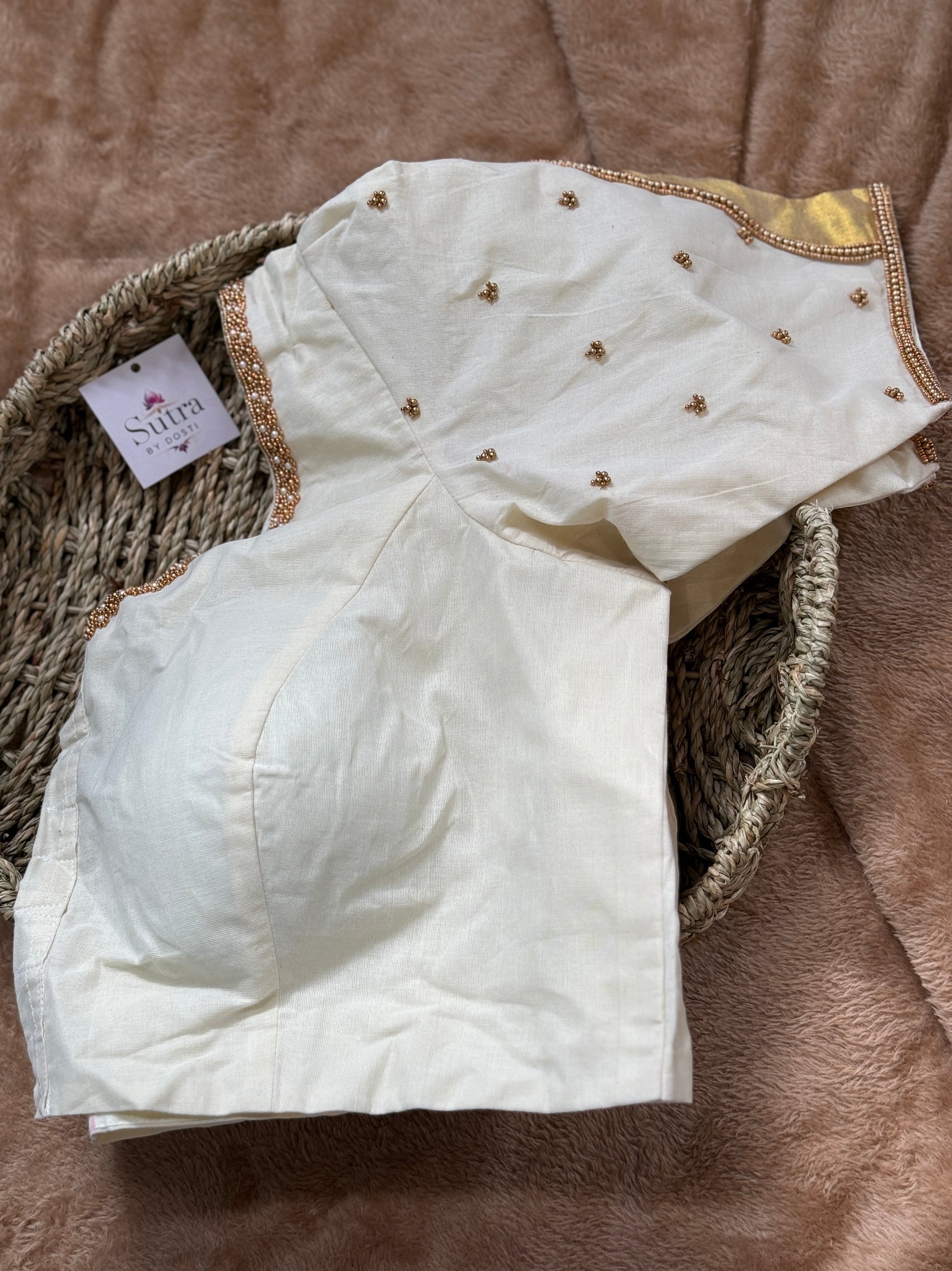 Understated elegance meets comfort in our Ivory Royale Blouse. Crafted from premium cotton, this padded blouse features elbow sleeves, delicate embellishments, and a graceful small U neckline with front hook closure. Perfect for pairing with sarees or skirts for festive and contemporary looks.