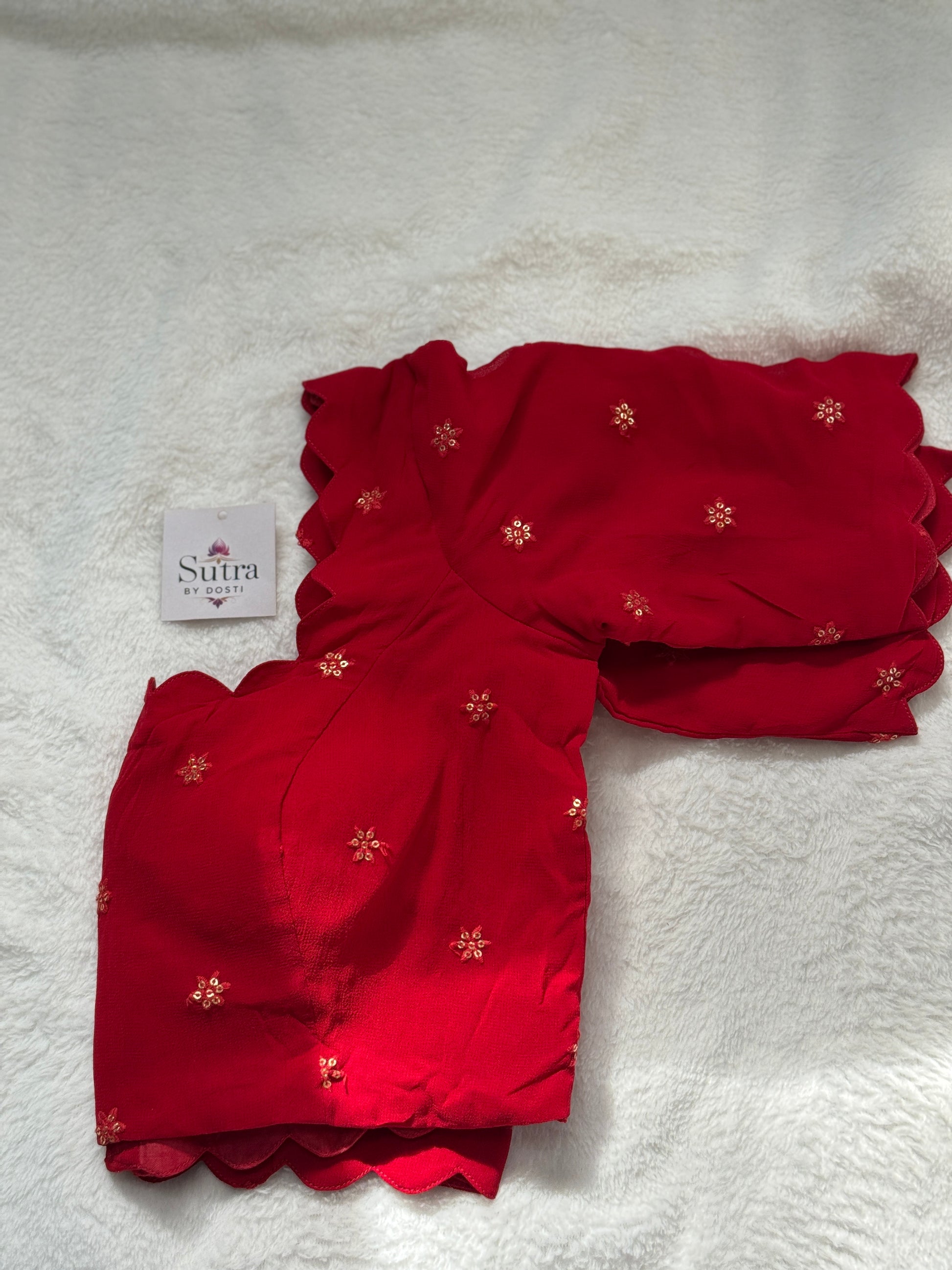 Bold, beautiful, and effortlessly chic – meet the Scarlet Scallop Blouse, designed to add a pop of elegance to your festive wardrobe. Crafted in premium georgette with delicate golden motifs and a flattering scalloped neckline, this blouse combines timeless charm with contemporary flair.