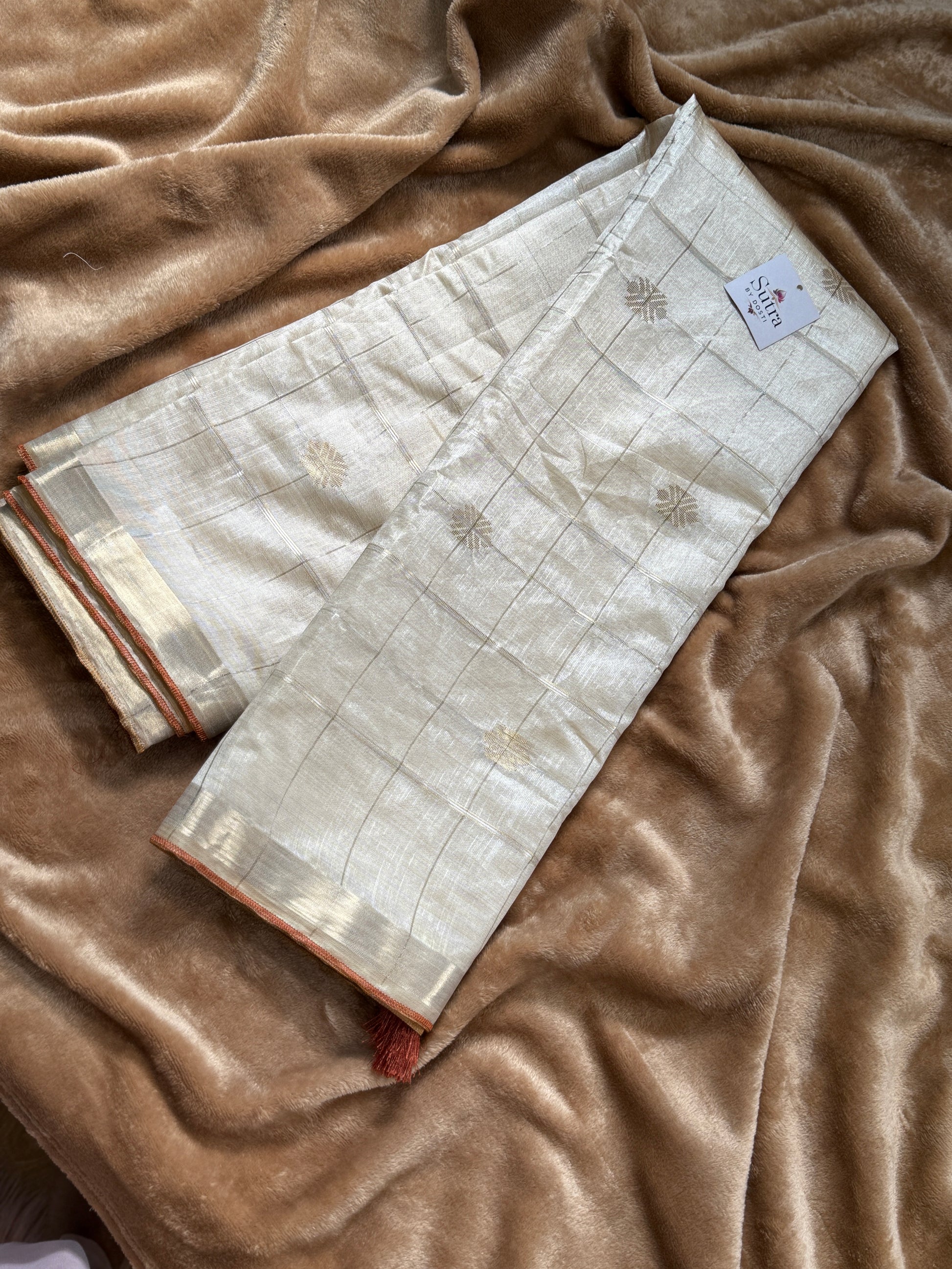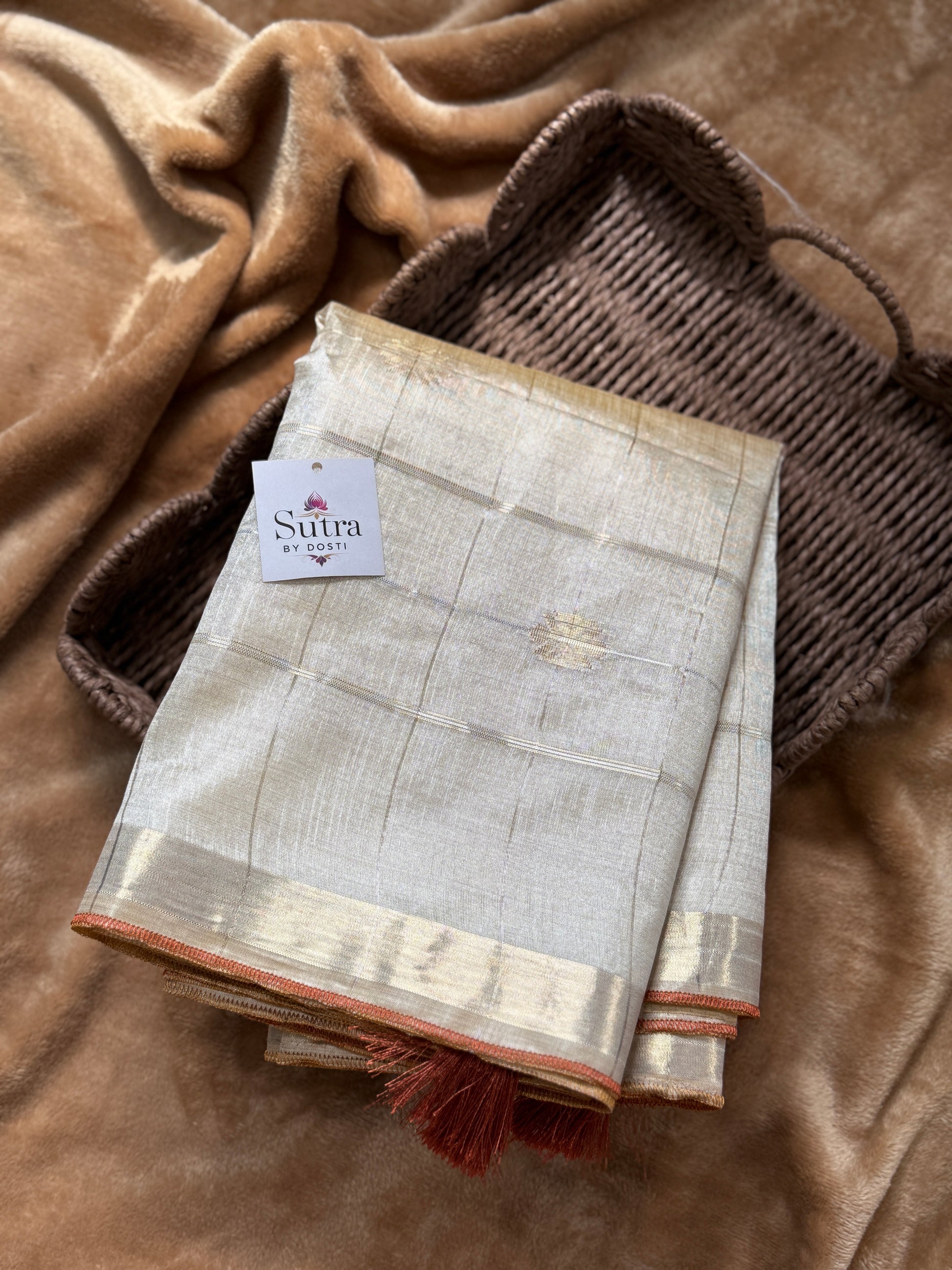 Fabric: Tussar silk Blouse: Tussar silk Saree Length: 5.5 Mtr. Blouse Length: 0.8 Mtr. Work: Zari woven work Care: Dry clean only |